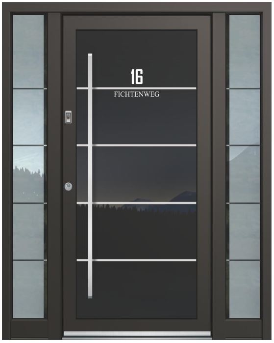 + die verschiedenen Applikationen aus rostfreiem Stahl (Schutzprofil, Hausnummer, Dekore) liegen außen bündig an – elegantes Design und einfache Reinigung